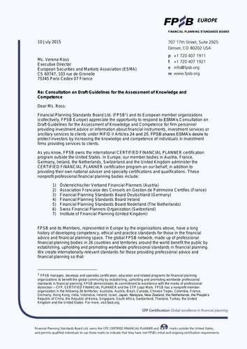 FPSB Response to ESMA Consultation on Draft Guidelines for the Assessment of Knowledge and Competence (2015)