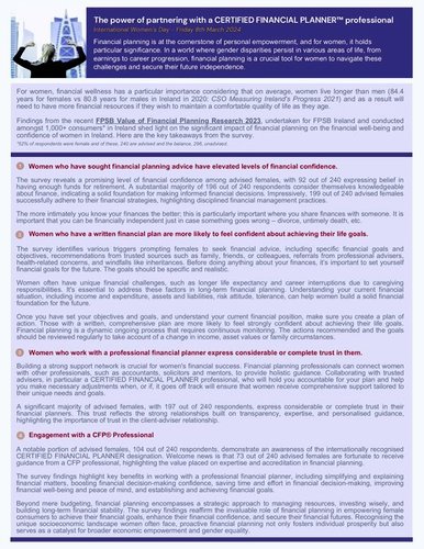 This FPSB Ireland document, created for International Women's Day, highlights the benefits of partnering with a CFP® professional, showing how financial planning improves women’s financial confidence, goal achievement, retirement readiness, and overall financial well-being.